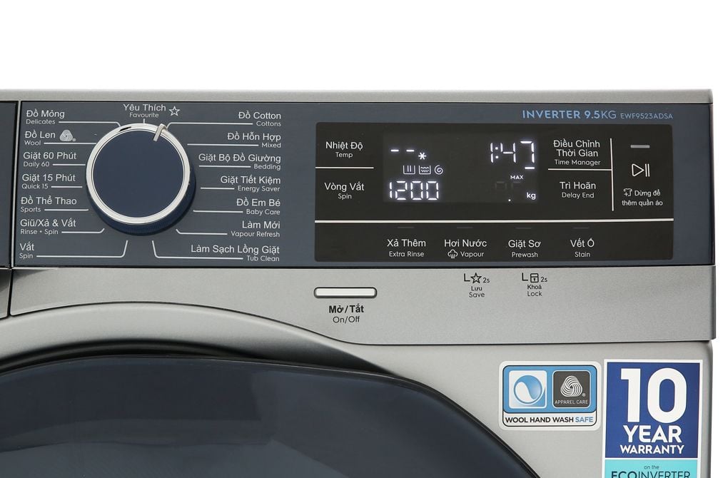 Máy giặt Electrolux Inverter 9.5 kg EWF9523ADSA mang sắc xám bắt mắt đi cùng thiết kế cửa trước hiện đại sẽ là một điểm nhấn tuyệt vời cho không gian nội thất. Hơn nữa, máy còn được trang bị bảng điều khiển cảm ứng song ngữ Anh – Việt, giúp bạn dễ dàng sử dụng hơn.