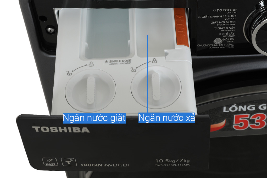 Máy giặt Toshiba Inverter TWD-T25BZU115MWV(MG) vừa có khả năng giặt như dòng máy giặt thông thường, vừa có thể sấy khô quần áo như dòng máy sấy quần áo trên cùng một sản phẩm. Thay vào đó, bạn không cần phải sắm 2 thiết bị này riêng biệt, giúp tiết kiệm chi phí và không gian lắp đặt đáng kể.