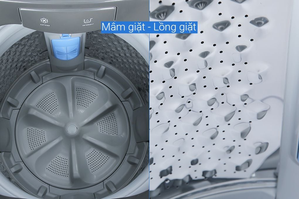 Lồng giặt được thiết kế với các gờ nổi hình ngôi sao kèm với nhiều lỗ phun nước có kích thước nhỏ li ti, trải đều khắp lồng giặt, nên làm tăng diện tích tiếp xúc và ma sát lên bề mặt quần áo, giúp loại bỏ vết bẩn dễ dàng đồng thời giảm thiểu sự hư tổn sợi vải trong quá trình giặt.