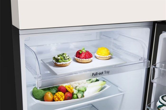 Dung tích ngăn lạnh 255 lít, gồm có 1 ngăn chứa Pull-out Tray, 2 kệ chia làm 3 ngăn, 1 hộc đựng rau củ và 3 khay chứa (bên cánh cửa).